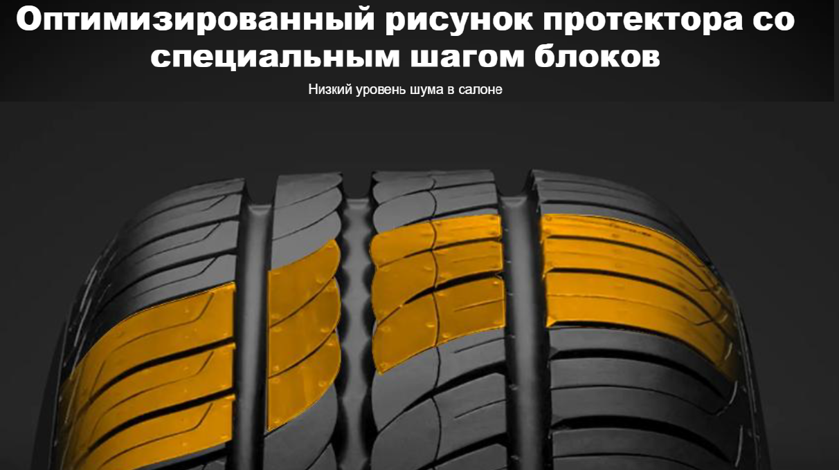 - Оптимизированный шаг блоков протектора уменьшает шум — в салоне сохраняется тишина даже на высоких скоростях.